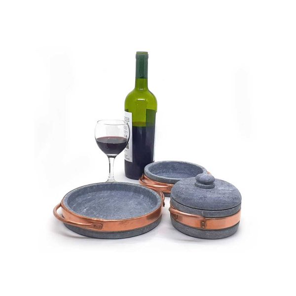 This Mini Cookware Set includes three cookware pieces: a 12cm Mini Cocotte, a 14cm Mini Rondeau, and an 18cm Mini Provolera, all crafted from natural soapstone, copper handles and a hoop.